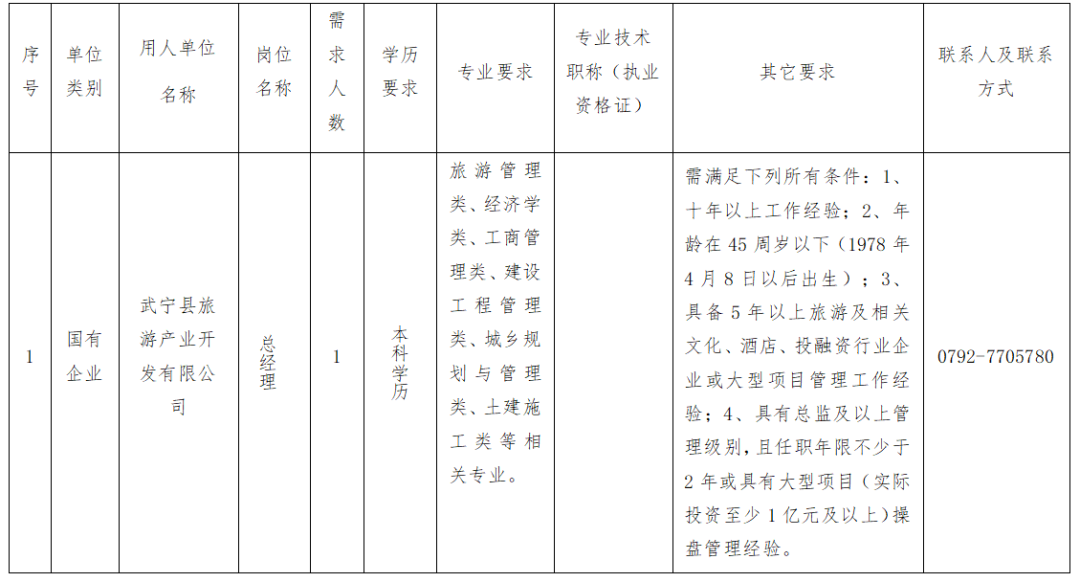 现面向社会公开招聘武宁县旅游产业开发有限公司总经理1名。具体岗位、人数及资格条件如下: