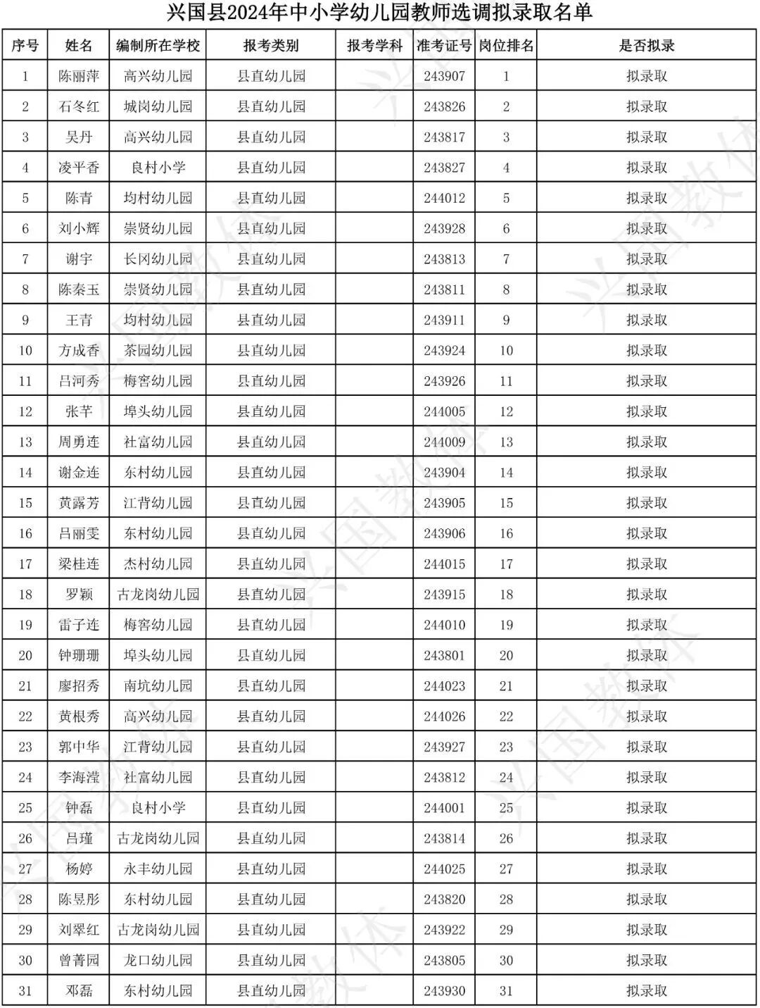 根据《兴国县2024年中小学幼儿园教师考试选调实施方案》精神,经笔试、查分等程序,现将各岗位学科拟录取人员名单公示如下(详见附件1),对拟录取人员如有异议,请于2024年8月16日前向县教体局反映,联系电话:0797-5203022(党办),0797-5203023(人事股)。