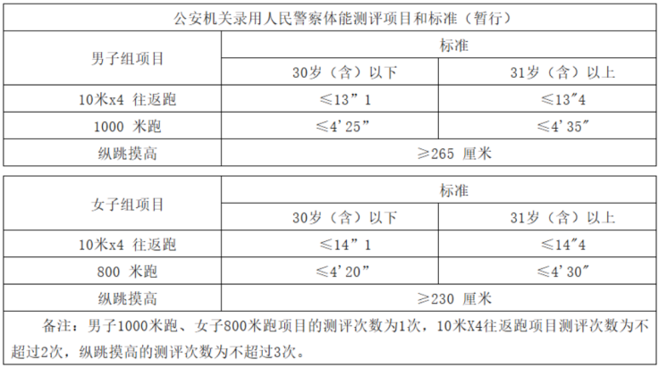 二、现场资格审查有关事项1.现场资格审查时间:2025年9月30日(周二),具体时间为上午08:00-上午12:00。2.现场资格审查地址:井冈山市新城区茅坪路与黄洋界大道交叉口(井冈山两山生态发展有限公司);入闱资格审查人员须在规定时间和地点参加资格审查,未按要求参加资格审查视为自动放弃。3.须考生本人亲自到场资格审查,不许亲属(朋友)代为资格审查。 4.资格审查所需资料如下: (1)本人有效居民身份证原件及复印件(正、反两面)一份; (2)毕业证原件及复印件一份; (3)取得大专以上学历的还需出具中国高等教育学生信息网的《教育部学历证书电子注册备案表复印件一份(需3个月以内查询信息)》; (4)本人近期(6个月内)一寸免冠正面彩色照片2张; (5)符合放宽招聘条件的须提供相应证明材料原件及复印件一份。 资格审查贯穿招聘工作的全过程。报考人员提交的学历、专业、年龄等信息和相关材料必须真实、准确、完整、有效。经审查,证件(证明)不全或所提供的证件(证明)与所报岗位资格条件不符以及主要信息不实,影响资格审查或无法完成资格审查的,取消报考人员应聘资格,后果由报考人员自行承担。 5.因资格审查不合格或自动放弃等原因产生的缺额,不予递补。请入闱资格审查的考生做好相关准备,保持通讯畅通。 6.笔试成绩查询:考生登录报名系统进行笔试成绩查询。 三、体能测试有关事项 1.体能测试时间:2025年9月30日(周二)下午14:00,签到入场时间:2025年9月30日(周二)下午13:00-14:00。考生需持身份证原件及《体能测试准考证》入场。(资格审查合格者现场领取《体能测试准考证》) 2.体能测试地点:井冈山市委党校(特巡警大队旁) 3.体能测评项目:男子1000米跑/女子800米跑、10米×4往返跑、纵跳摸高。体能测评采取达标制,标准按照《公安机关录用人民警察体能测评项目和标准(暂行)》执行。详见下表:
